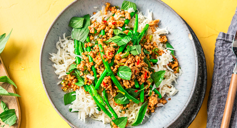 Жаркое из свинины по-тайски с зеленой фасолью и рисом