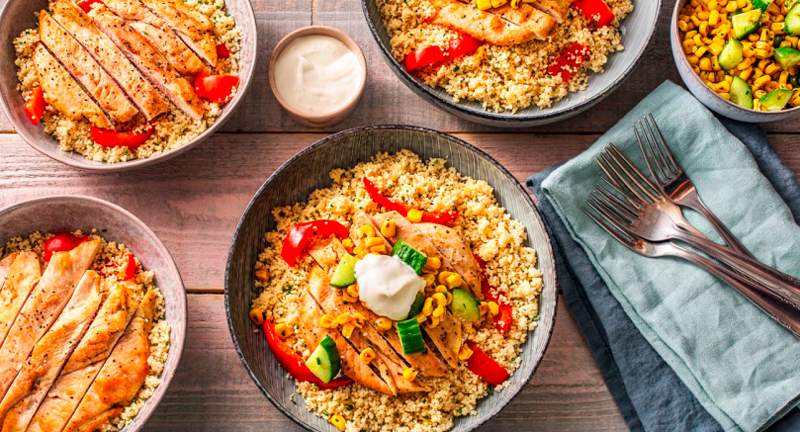 Курица в масле с кускусом, поджаренной сальсой и сметаной